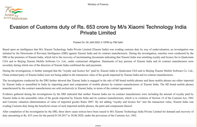 1月5日,印度财政部(Ministry of Finance)发布声明,已经向小米科技印度公司(Xiaomi Technology India Pvt.)发出通知,在调查发现该公司有逃税行为后,向小米追缴65.3亿卢比(约5.59亿人民币)税款。