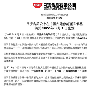 1月5日,据港交所公告,日清食品有限公司(以下简称“日清食品”)宣布将上调其主要即食面产品在中国内地的出厂价格,平均增幅的百分比属中单位数,2022年3月1日起生效,产品包括合味道杯面、出前一丁(包装、杯装及碗装面)、日清意面、拉王等。