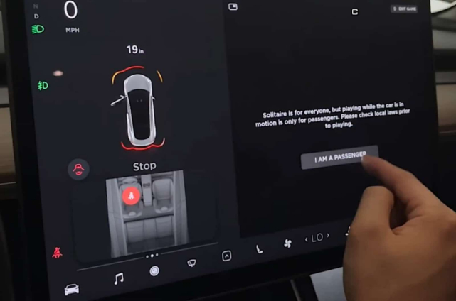 在这次OTA前,特斯拉车内屏幕只能在车辆静止状态下运行游戏。但更新后,车辆在行进中开启游戏时,触摸屏会提示“在汽车行驶时玩游戏只适合乘客”,并让玩家点击按钮确认自己是乘客。