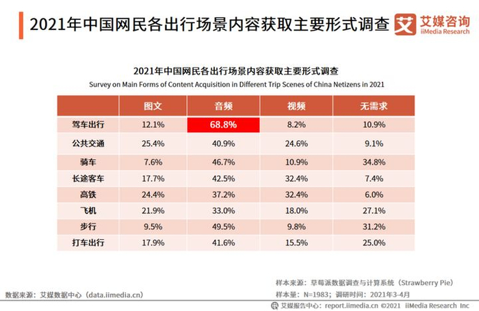艾媒咨询数据显示,各出行场景中,车载端音频形式获取内容的用户占比最高,达到68.8%。艾媒咨询分析师认为,出行属于典型的伴随性场景,音频是内容获取的最主要方式,且替代性低。