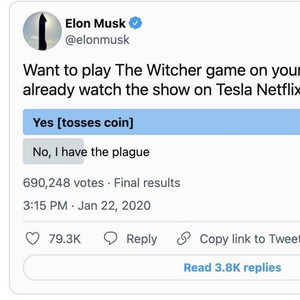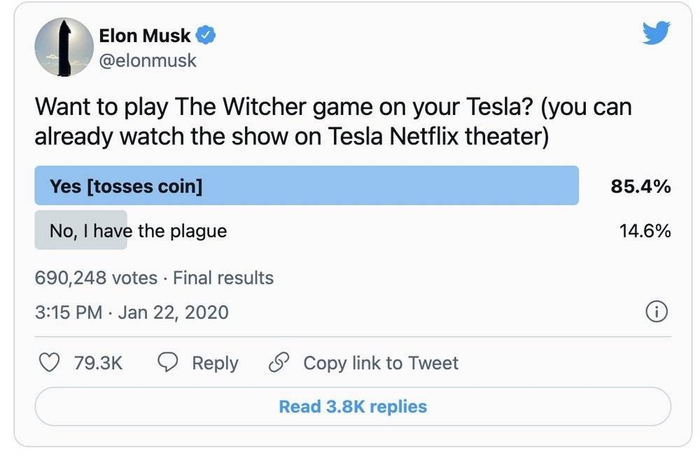 2020年1月22日,埃隆·马斯克以特斯拉首席执行官的身份,在社交平台上发起了一项关于汽车生活新图景的提案:你想在自己的车上玩《巫师3》吗?