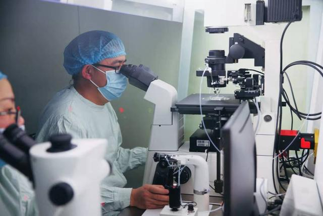 成妇儿生殖中心胚胎实验室负责人滕文顶正在进行囊胚活检操作