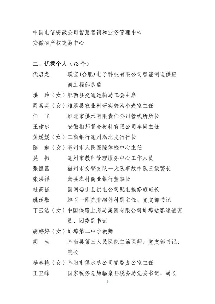 合肥市第二人民医院等20个单位获命名“安徽省职工职业道德建设标兵单位”、合肥市轨道交通集团有限公司运营分公司电客车司机队长宋能超等20名个人获命名“安徽省职工职业道德建设标兵个人”。此外,安徽省总工会和省文明办决定命名合肥供水集团有限公司等68个单位为“安徽省职工职业道德建设优秀单位”,命名联宝(合肥)电子科技有限公司智能制造供应商工程部总监代启龙等73人为“安徽省职工职业道德建设优秀个人”。