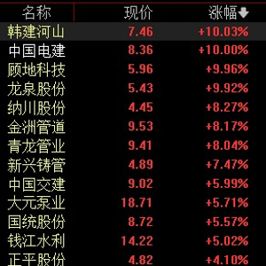 1月6日,水利概念股走强,截至发稿,韩建河山(603616)、中国电建(601669)、顾地科技(002694)、龙泉股份(002671)涨停,青龙管业(002457)、新兴铸管(000778)等个股纷纷跟涨。