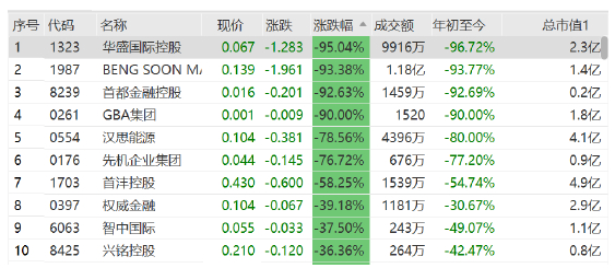 截至发稿,华盛国际控股跌95%,BENG SOON MACH跌97%,现跌幅收窄至约93%;首都金融控股跌近93%;GBA集团跌90%,先机企业集团跌近77%,汉思能源跌79%。