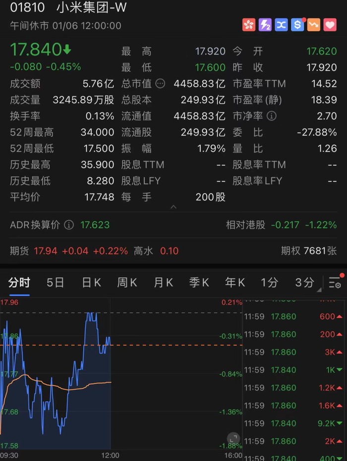 小米港股周三收跌3.5%,周四(6日)股价低开1.67%,报17.62港元,盘中震荡上行,截至今日午间收盘,小米跌幅收窄,下跌0.45%,报17.84港元,最新市值为4458.83亿港元。