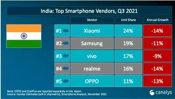 Canalys数据显示,2021年第三季度,小米在印度的智能手机市场份额位列第一,同比减少14%。