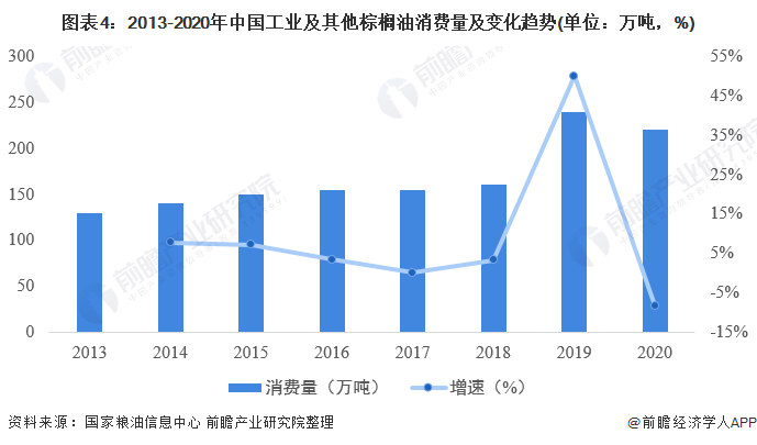 2013-2020年,中国工业及其他棕榈油消费量整体呈现上升趋势。2019年,我国棕榈油消费量大幅增长至240万吨,相比2018年增长了50%。2020年,中国工业及其他棕榈油消费量为220万吨,相比2019年减少了8.33%。