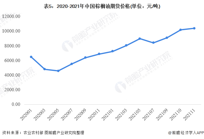 2020-2021年,中国棕榈油期货价格持续上涨。2021年9月,中国棕榈油期货价为10398.59元/吨,相比上月上升了2.06%,相比2020年5月价格低点上涨了126.85%,期货价翻倍。