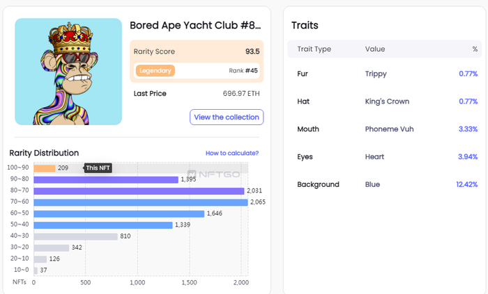 在BAYC,每个Bored Ape(无聊猿猴)都是独一无二,并由170多种可能的特征以编程方式生成,包括表情、头饰、服装等。根据每种特征的稀有程度不同,每个猿猴头像价格差距也非常悬殊。