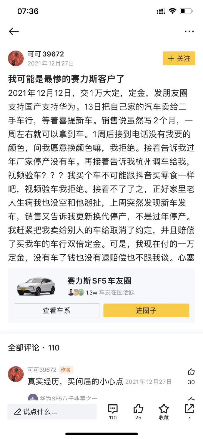 2021年12月23日,华为在冬季旗舰新品发布会上发布了AITO品牌旗下首款车型问界M5,4天之后,一位网友便在社交平台发出“我可能是最惨的赛力斯客户了”的吐槽。