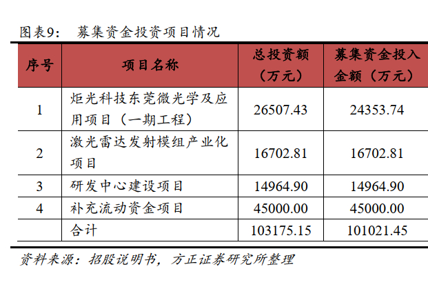 公司本次募集资金主要用于扩大激光光学元器件产能,提高公司研发能力及产品的市场应用能力。其中,炬光科技东莞微光学及应用项目(一期工程)项目规划总建筑面积2.06万平方米,设计年产能为年产激光光学元器件0.26亿只,项目全部达产后年度产值预计可达到2.53亿元;激光雷达发射模组产业化项目规划建筑面积约1.2万平方米,设计产能为年产激光雷达发射模组306.99万台,投产后预计平均实现年销售收入2.98亿元,有助于公司提升市场销售规模和市场占有率。