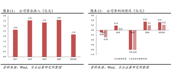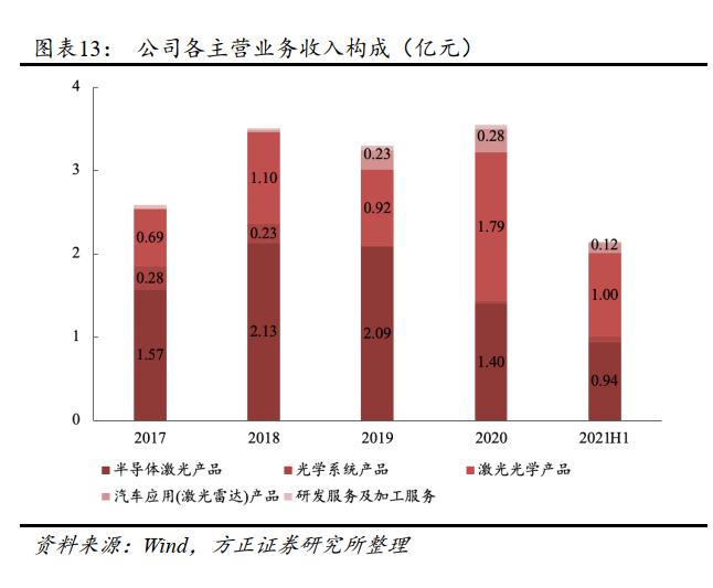 公司营收呈增长态势,归母净利有所波动。 公司营收主要来源于半导体激光产品和激光光学产品。2018年至2021H1,公司营业收入分别为3.55、3.35、3.60、2.18亿元;归母净利润 0.19、-0.80、0.35、0.33亿元;扣非归母净利润-0.01、-0.81、0.20、0.22 亿元。