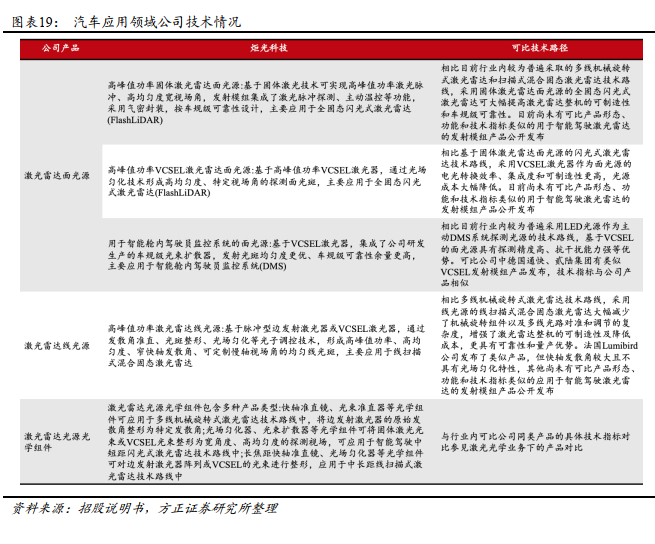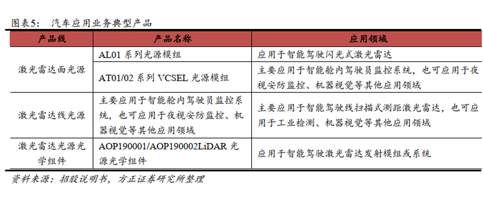 在 汽 车 应 用 领 域 主 要 开 拓 的 细 分 市 场 包 括 智 能 驾 驶 激 光 雷 达(LiDAR)、智能舱内驾驶员监控系统(DMS)。主要应用业务主要包括激光雷达面光源、激光雷达线光源、激光雷达光源光学组件等。公司与德国大陆集团签订了《战略供应商合同》和《项目协议》,约定在智能驾驶激光雷达技术领域开展合作,德国大陆集团向公司采购激光雷达发射模组产品,框架协议总金额折合人民币约4亿元。