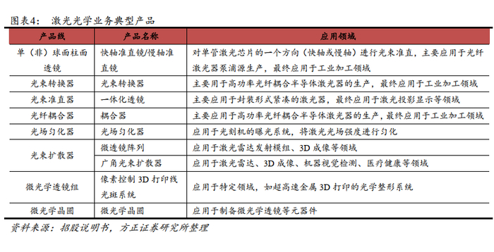 公司拥有细分领域领先的激光微光学技术。激光光学业务主要包括光束准直转换系列(单(非)球面柱面透镜、光束转换器、光束准直器、光纤耦合器)、光场匀化器、光束扩散器、微光学透镜组、微光学晶圆等。子公司LIMO是领先的激光光学元器件、光子应用模块和系统研发及生产商,曾获得国际光学工程学会(SPIE)颁发的全球光电行业最高荣誉之一Prism Awards棱镜奖。