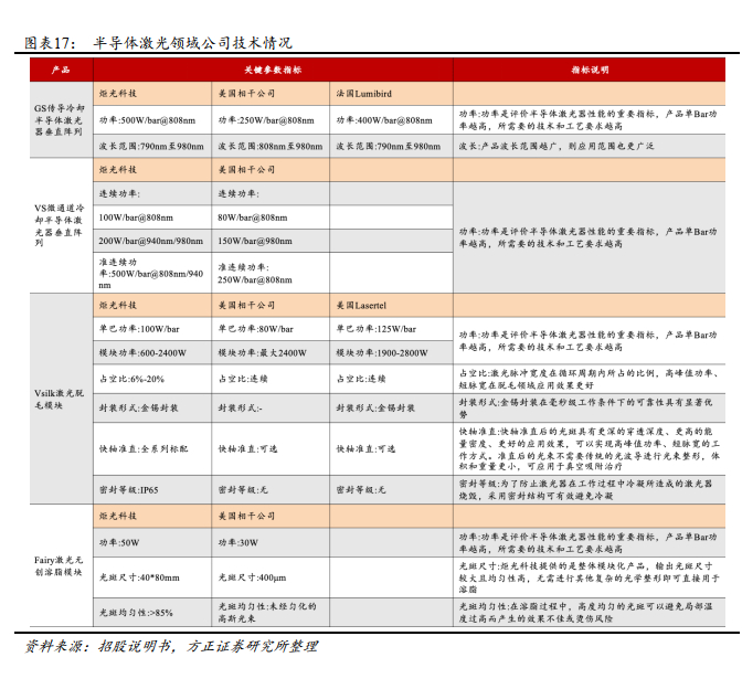 在半导体激光领域, 炬光科技的激光元器件处于国内领先地位。 主要市场参与者大多数是来自于欧美发达国家的行业巨头,如美国相干公司、美国IPG光电、美国nLight和法国Lumibird等。国内锐科激光、杰普特、联赢激光等主要提供光纤激光器或激光设备,分布于产业链中下游,较少涉及上游激光元器件领域。