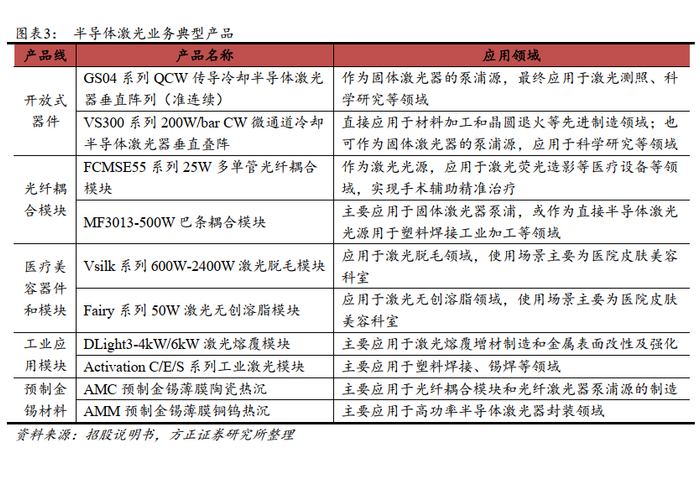 高功率半导体激光技术具有国际竞争力, 得到细分行业头部客户认可。半导体激光业务以高功率半导体激光元器件为基础,分为开放式器件、光纤耦合模块、医疗美容器件和模块、工业应用模块、预制金锡材料等。公司的高功率半导体激光产品被应用于有“人造太阳”之称的国家惯性约束可控核聚变试验装置重大项目。科研团队曾撰写高功率半导体激光器封装专著《 Packaging of High Power SemiconductorLasers》由世界著名出版商 Springer(施普林格)出版发行。