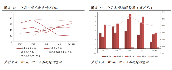 毛利率整体呈增长趋势。2018 至 2021H1,公司毛利率分别为 41.82%、38.26%、 51.01%和 54.40%。2020 年公司对 LIMO 进行战略性结构重组,东莞炬光新增光束准直转换系列产品的后端生产线,提高了产能及生产效率,此外公司拓展国内的市场,销售占比大幅上升,使激光光学业务毛利贡献率大幅上升。研发费用逐步增长,期间费率相对稳定。 2018 至 2021 年上半年,公司研发费用分别为 0.55、0.75、0.70、0.35 元,研发费率分别为 15.38%、22.35%、 19.42%、 16.19%,主要系公司“产生光子、调控光子和提供光子技术应用解决方案”的全方位布局,光子技术应用解决方案的研发涉及激光、光学、系统集成、工艺开发等多个技术领域,研发投入较大。2018 至 2021 上半年,公司期间费率分别为 38.35%、 54.62%、 43.56%、 39.33%。