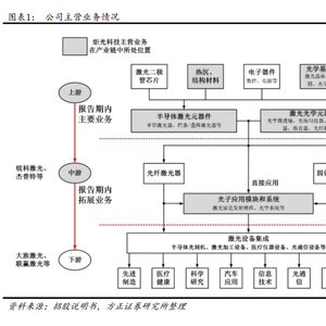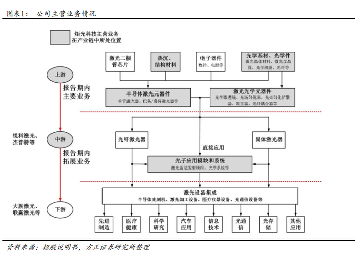公司主要从事激光行业上游的高功率半导体激光元器件、激光光学元器件的研发、生产和销售,正在拓展激光行业中游的光子应用模块和系统。公司为固体激光器、光纤激光器生产企业和科研院所,医疗美容设备、工业制造设备、光刻机核心部件生产商,激光雷达整机企业,半导体和平板显示设备制造商等提供核心元器件及应用解决方案,产品逐步被应用于先进制造、医疗健康、科学研究、汽车应用、信息技术五大领域。公司产品的技术水平、性能和可靠性指标会直接影响中下游激光应用设备的质量和性能,是产业链中的关键环节。