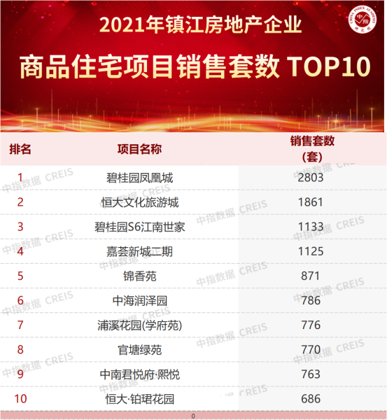 2021年,镇江商品住宅销售套数排行榜TOP10项目合计销售11574套。碧桂园凤凰城以2803套的销售业绩排在销售套数排行榜首位,表现优异;恒大文化旅游城位居第二,成交1861套;碧桂园S6江南世家以1133套位居销售套数榜单第三位。
