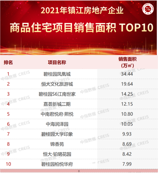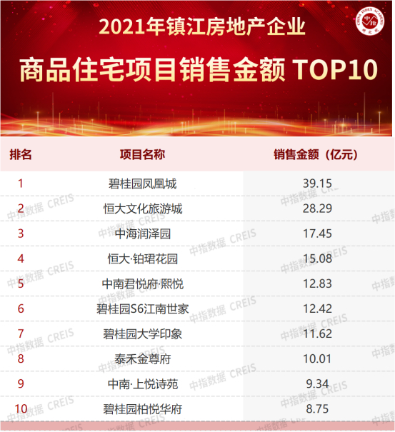 特别说明:房地产企业销售数据统计与项目销售数据统计均是以2021年1月1日-12月31日期间商品住宅合同销售额为依据,主要依据中指数据CREIS(点击试用)在镇江的销售监测数据;本报告所提到的TOP10企业合计销售金额与面积均剔除了合作开发项目的重复计算额。