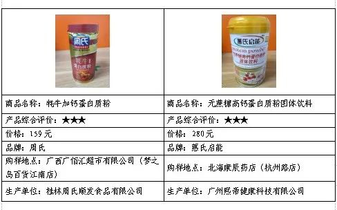 周氏牌牦牛加钙蛋白粉、蕙氏启能牌无蔗糖高钙蛋白质粉固体饮料2款样品的蛋白质含量较低,分别是12.5g/100g和14.2g/100g,这与鸡蛋的蛋白质含量(13.1g/100g)水平相当。