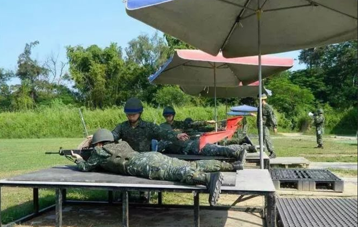 台军训练时大型遮阳伞做防晒,铁架悬空,铺有软垫(资料图)