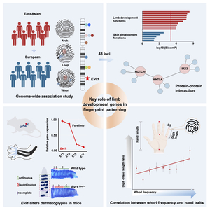 “我们观察到,这些基因显著富集在肢体发育与形成的相关通路,而非皮肤发育相关通路。”研究团队介绍,位于3q26.2区域临近EVI1基因的变异位点与中间三枚手指指纹的复合表型显著相关,从而为上世纪初即被发现的“指纹模块现象”(中间三枚手指指纹高度相关)提供了表型组学和遗传学解释。