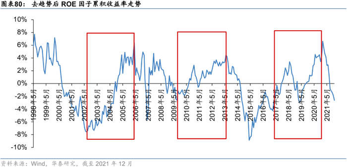 DDM模型分子端的ROE反映了企业的盈利水平。以ROE为代表的盈利因子,经过去趋势后观察累积收益也能发现明显的周期特征。
