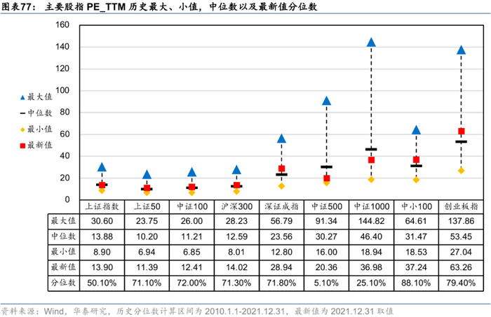 我们统计了A股主要股指自2000年以来的PE_TTM与PB_LF,观察其最大最小值和中位数,并计算最新值的历史分位数。截至2021年底,中小100、创业板指的PE历史分位数相对较高,分别为88.10%和79.40%,其中创业板指的PB历史分位数已达到88.60%,位于历史较高位置;中证500、中证1000的PE历史分位数相对较低,分别为5.10%和25.10%,但中证1000的PB分位数在58.30%;其余股指的PE历史分位数大多在50%-75%区间。