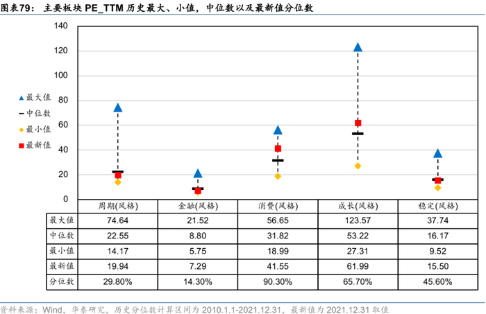 风格板块方面,我们统计了各个风格板块2010年以来的PE_TTM。观察各板块估值指标的最大最小值、中位数以及最新值的分位数可以发现:金融板块和稳定板块的绝对估值水平较低,PE分别为7.29和15.50,金融板块PE估值分位数较低,为14.30%。成长和消费板块的绝对估值水平较高,PE分别为61.99倍和41.55倍,其中消费板块相对估值水平较高,PE历史分位数在90.30%。