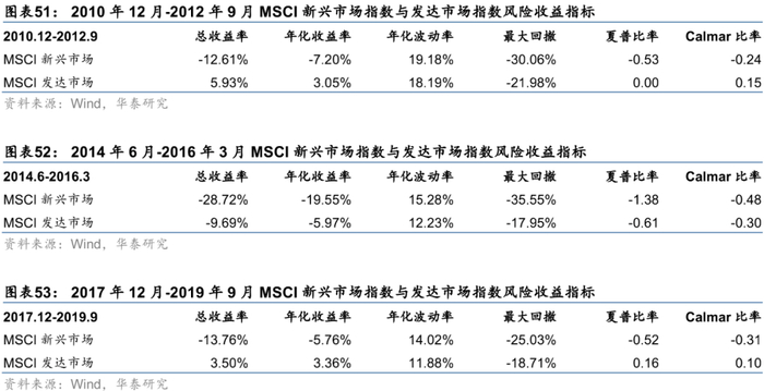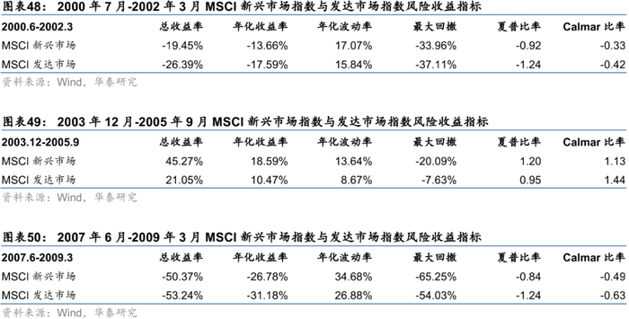 \进一步地,我们统计1995年至今历轮完整基钦周期内MSCI新兴市场指数和MSCI发达市场指数筑顶后下行阶段的风险收益指标,如下图表所示。除2003年12月至2005年9月新兴市场整体表现更佳外,其余历轮周期的下行阶段,新兴市场指数在年化收益和夏普比率上均为负值,且在多数情况下年化波动率和最大回撤超过发达市场。