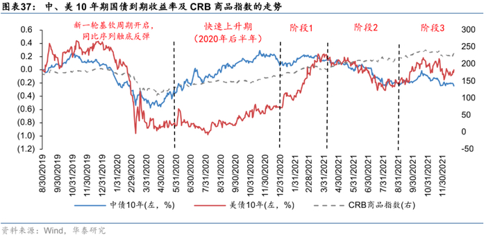 1. 阶段1:2021年一季度,实体经济短周期滤波处于接近顶部的上行区间。基本面延续2020年年末实体经济回暖、全球流动性环境宽松的态势,中国10年期国债收益率和CRB商品指数整体呈现基本面企稳回升的节奏,美国10年期国债收益率大幅上涨。