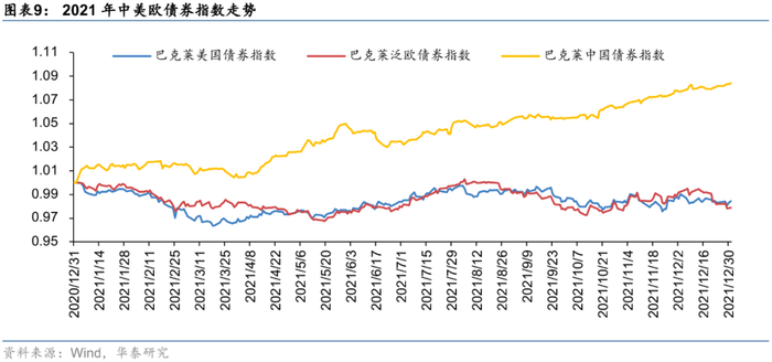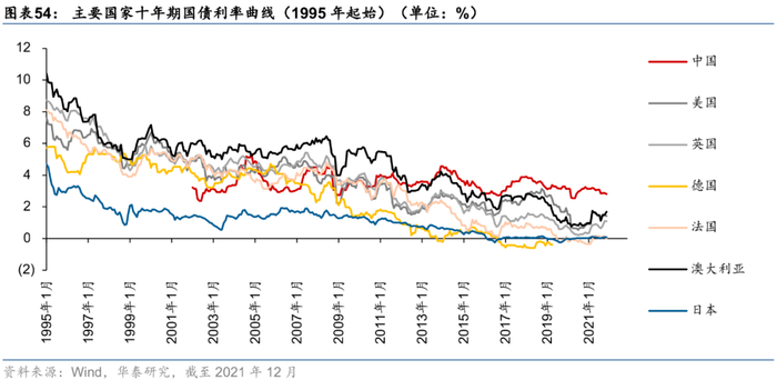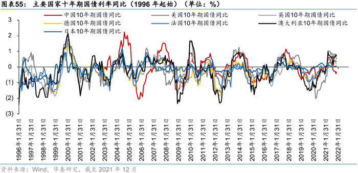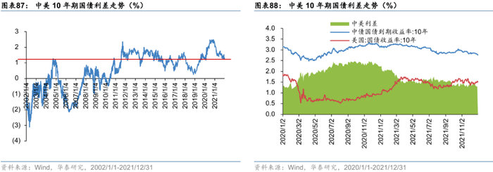 对比中美10年期国债利率,2021年美国10年期国债利率整体呈M型走势,使得中美利差在年初快速下行,随后维持在1.3%-1.5%的水平。从长期来看,当前中美利差仍处于历史偏高位置,后续继续缩窄的可能性较大。考虑到中美两国经济、政策情况的不同,2022年中美利差缩窄或由中国利率下行,美国利率下行速度不如中国,大概率走平导致。