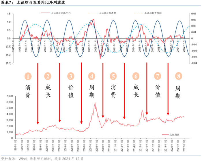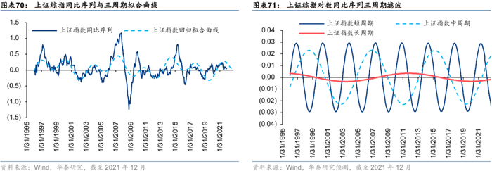 本节我们对A股的周期状态做更加深入的探讨,总体来看,上证综指同比序列短周期目前已见顶回落,中周期处于正值向上的趋势中,长周期已于2020年中开始缓慢持续上行,三周期同比拟合序列或将于2023年初见底,2022年处于从正值向下回落的趋势中。我们判断,2022年A股全面上涨概率较低,可能存在结构性获利行情。
