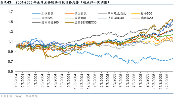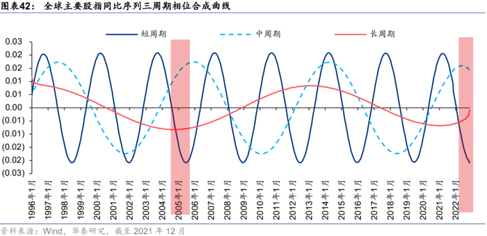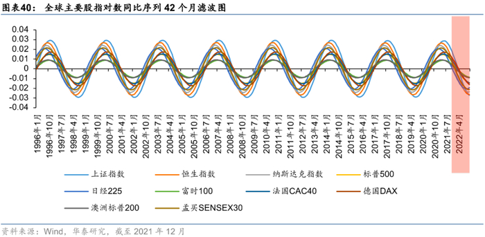 从滤波结果来看,2001年12月短周期开始上行,2005年6月为下一个底部拐点。结合2004年中-2005年中全球主要股票指数的价格走势,我们可以进一步对今年股票市场进行分析预判。整体而言,2004年中-2005年中全球各股票指数多数呈现震荡趋势,表现较为疲弱,2004年6月至2005年6月发达国家股指横盘震荡,发展中国家股指如印度孟买SENSEX30与澳洲标普200等则是先经历大幅下跌再收复跌幅。类比到2022年,股票市场或将走弱但大幅下行概率不大。