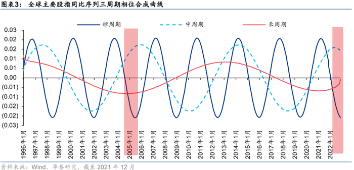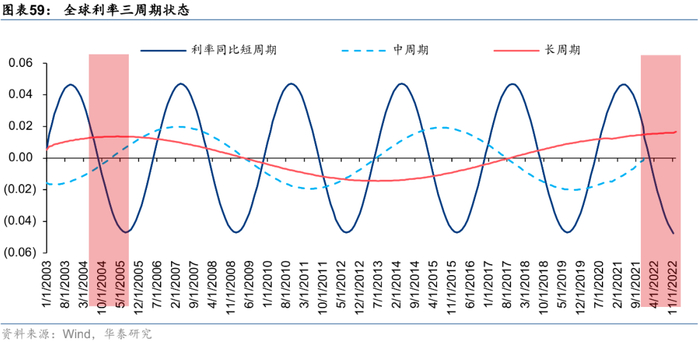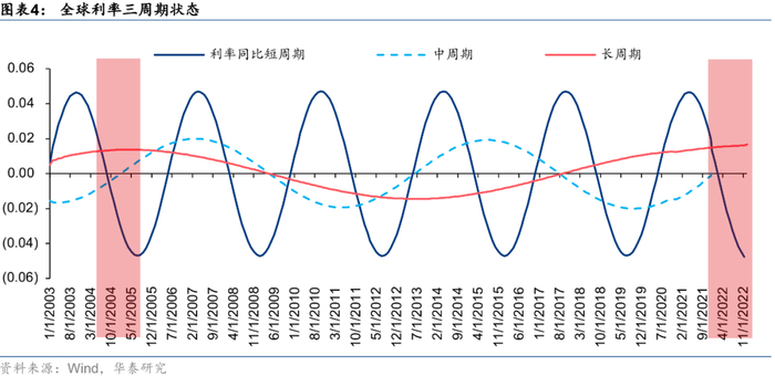 此外,从历史数据来看,利率实际走势会因为短期扰动而相对周期产生一定偏离。2022年利率三周期状态与2004-2005年相似,均为短周期下行穿过零轴、中周期上行穿过零轴、长周期位于顶部区域。当时的经济背景也与当前相似,2000年互联网泡沫破灭后经济疲弱股市下行,各国开始降息提振经济,美联储则是多次连续大幅降息,导致2003年通货膨胀态势严峻,最终美国在2004-2005年宣布加息以应对通胀。