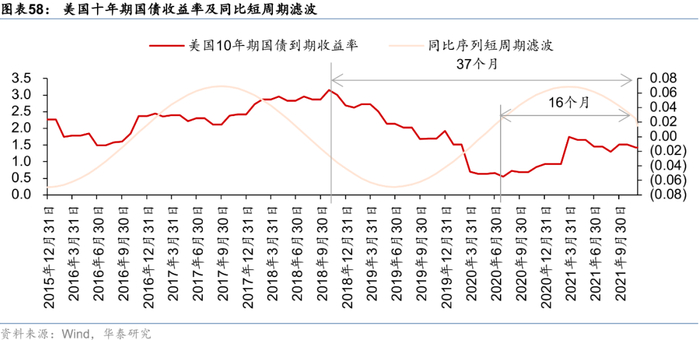 如前所述,同比序列周期底部拐点以及其当前所处位置是我们需要着重关注的,对比历轮同比序列短周期滤波拐点与原始序列的拐点可以发现,原始序列的周期涨跌呈现一定程度的不对称性,短周期相位相对同比序列有一定滞后,且同比序列触底通常比真实序列早4个月左右。其中美国十年期国债利率原始序列距离上一个顶部拐点为37个月,距离上一个底部拐点为16个月。按照周期长度来推算,2022年利率在上半年经历短暂上行后,进入增速放缓的下行区间。
