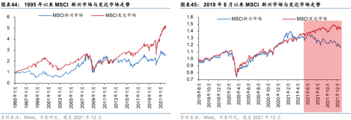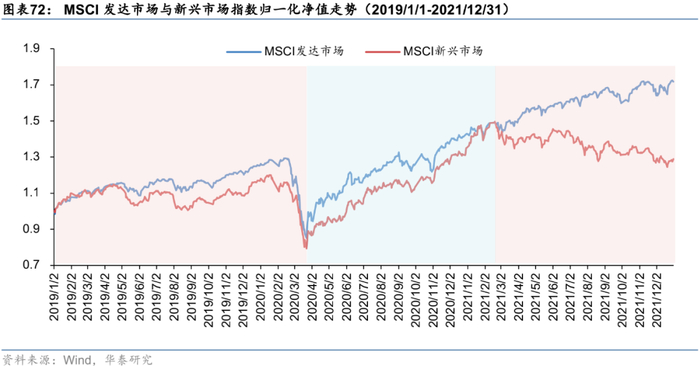 近几年从上轮周期到本轮周期,新兴市场与发达市场股市的相对走势历经了三个阶段:2019年初至2020年3月,MSCI新兴市场指数整体表现不如MSCI发达市场;疫情爆发导致全球股市恐慌性下跌后,在2020年4月-2021年3月期间,MSCI新兴市场上涨弹性更大;从2021年3月至12月,MSCI发达市场整体上行,但MSCI新兴市场股市震荡走低。