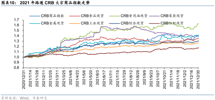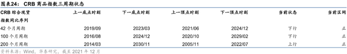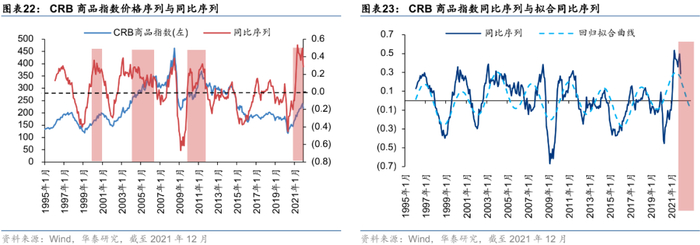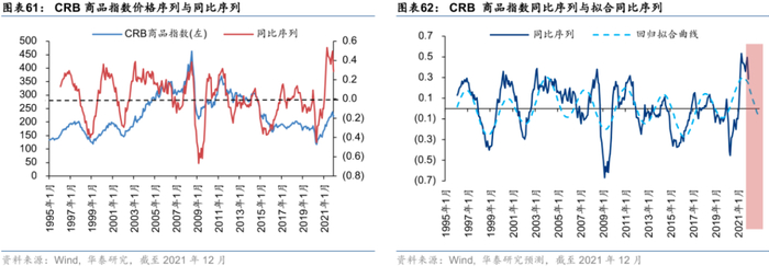 我们预计2022年CRB指数同比增速将持续下降,导致商品走势相对弱于2021年和2020年,但长周期仍能够为指数提供一定支撑,大幅下行概率不大。且从历史周期状态来看,当前短周期下穿零轴、中周期在正值区间下行、长周期位于顶部的周期状态与2004-2005年区间类似,在该区间内大宗商品价格仍处于上涨状态,但同比增速有所回落。