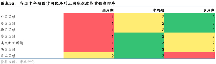 接下来我们对“同比”处理后的利率序列进行滤波分析,结果显示,各国十年期国债同比滤波结果多为短周期能量最强。其中,中国、美国、德国、英国、澳大利亚和法国国债同比滤波均为短周期能量最强,中长周期能量较小;仅日本的国债收益率同比序列存在一定的中长期趋势,虽然短周期不是能量最强的周期,但其规律也是清晰可见的。因此接下来我们将主要关注利率的短周期走势。