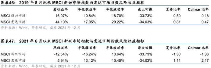 本轮基钦周期运行至2021年12月底已历经28个月,一般来说,至31个月附近才会进入下行负值区,但目前MSCI新兴市场指数的平均年化波动率(18.70%)已接近历次周期下行阶段MSCI新兴市场市场指数年化波动率(18.98%);目前最大回撤(-33.73%)接近历次周期下行阶段最大回撤(-34.99%)。表明新兴市场本轮下行阶段的风险已于2021年6月至2021年12月间有所释放。