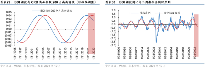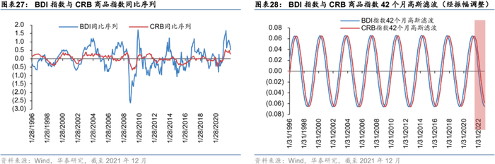 根据波罗的海干散货指数的周期滤波图可以看出,三周期叠加后拟合同比序列在2022全年处于下行区间,并将于二季度进入负值区间,2023年出现周期底部。波罗的海干散货的周期状态也进一步佐证了2022年大宗商品或将整体走弱。