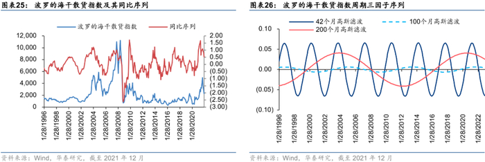 综合来看,波罗的海干散货指数的周期相位稳定领先于CRB综合现货指数,两个指数的走势虽然主要由短周期驱动,但长周期的规律也佐证了波罗的海干散货指数可以作为大宗商品的领先观察指标的结论。