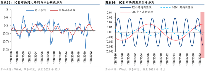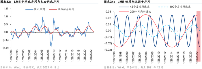 而2022年全球宏观经济状态与2004-2005年类似,在基钦周期顶部回落、中长周期提供支撑、经济增长逐渐减速的背景下,铜和原油等商品的需求或将保持稳定或略微减少。从铜和原油价格同比序列的三周期滤波图来看,回归拟合曲线的整体拟合效果较好。2022年预测同比序列整体仍处于正值区间,意味着以基本金属和原油为代表的大宗商品在2022年价格增速或将降低,但大幅下跌概率较小。
