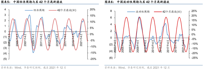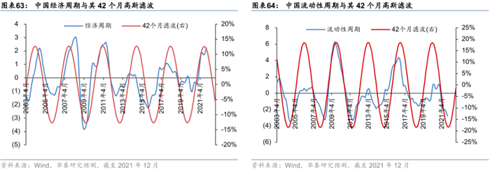 当前经济周期和流动性周期及其42个月高斯滤波结果如下图表所示。2021年经济周期持续上行,流动性周期在2021年二季度后拐头向下,流动性环境逐步收紧。步入2022年,经济周期或将拐头向下,而流动性周期预计将触底反弹,这就意味着经济增长压力有所增加,流动性相比2021年会有所宽松。