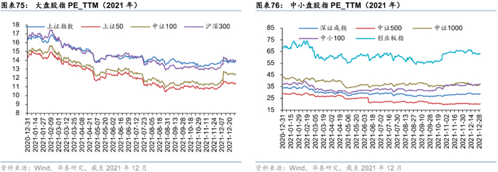 2021年大盘股指估值持续走低,当前中证500估值仍处低位,创业板指估值相对较高