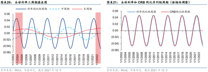 除此以外,全球利率水平也能一定程度上帮助判断宏观经济的状态。当经济基本面向好时,企业盈利增加,融资需求扩张,推动利率上行,反之则利率水平回落。为了判断全球利率周期状态,我们把中、美、日、英、法、德几个主要经济体的十年期国债收益率三周期滤波后分别进行合成,对比利率合成指标和代表实体经济走势的CRB同比序列三周期滤波结果,利率与实体经济的短周期基本同向变动,这说明短周期的经济基本面变化会带动对信贷资源的供给需求发生变化,并同步反映到利率水平上。