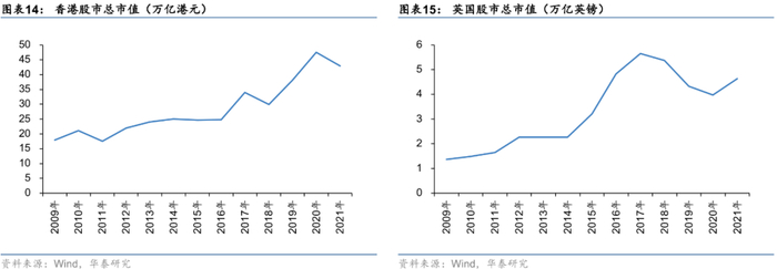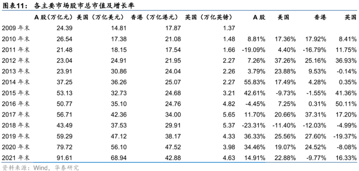 下面我们观察纽伦港世界金融中心股市和A股股市规模的历史扩张情况。2021相比2020年,美国股市规模扩大幅度全球最高,香港股市市值规模经历两年的大幅增长在21年略有下滑。美国股市规模从2009年末的14.81万亿美元上升至2021年末的68.94万亿美元,其余市场的市值规模涨幅均不如美国。其中A股从24.39万亿元上升至91.61亿元。