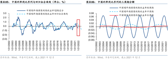 根据滤波结果可以看出,我国10年期国债收益率同比序列走势受短周期影响最大,当前短周期已拐头向下,中周期下行,长周期影响较小,三周期叠加后,2022年利率呈现下行趋势,但需要注意的是,利率同比数据与拟合曲线已出现一定背离,未来短期可能出现实际利率向拟合曲线回归的情况,从而导致债券资产出现波动。整体而言,2022年我国债券市场应具备趋势性投资机会,但过程中也应注意防范震荡风险。